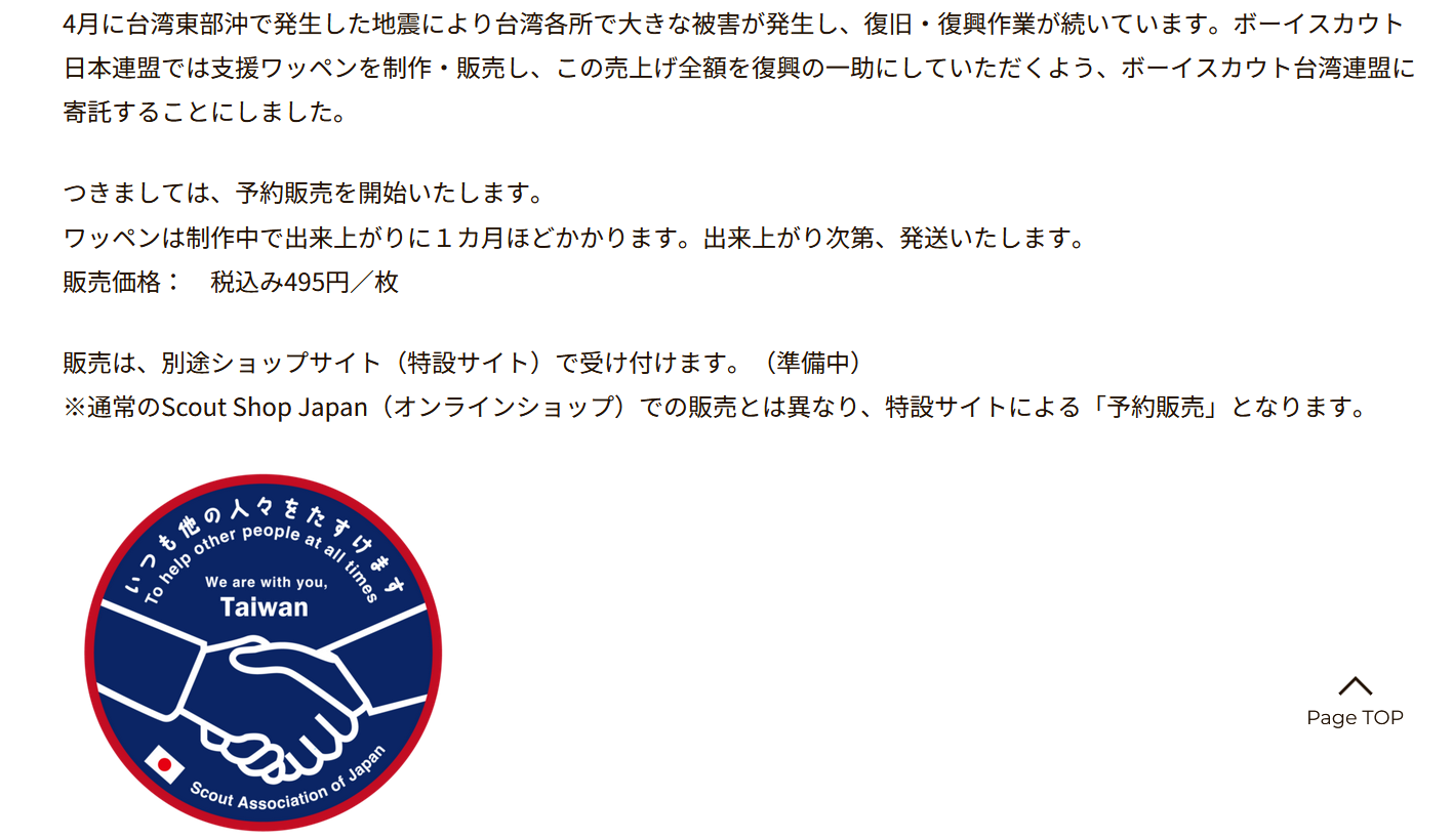 ボーイスカウト日本連盟では支援ワッペンを制作・販売し、この売上げ全額を復興の一助にしていただくよう、ボーイスカウト台湾連盟に寄託することにしました。